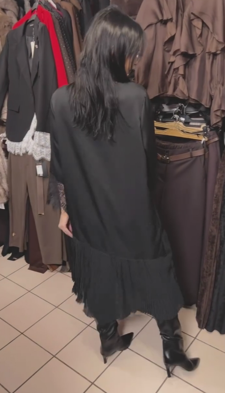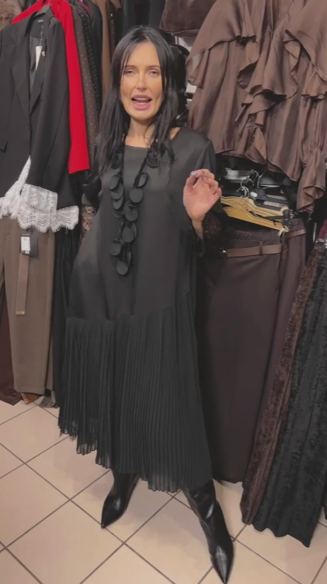 A singularidade deste vestido reside na sua versatilidade! O corte solto e os detalhes elegantes permitem usá-lo tanto para o trabalho (com sapatos) como para reuniões noturnas (com saltos altos) – basta trocar os acessórios para mudar o estilo num instante.